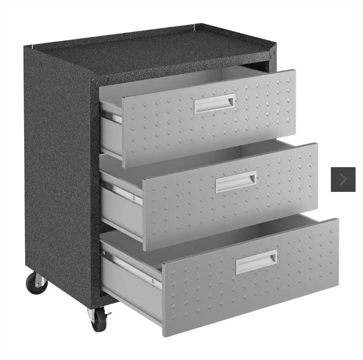 - Includes 1 Mobile Garage Chest with 3 Full Extension Drawers, 1 Garage Cabinet with 1 Adjustable Shelf, and 1 Worktable.