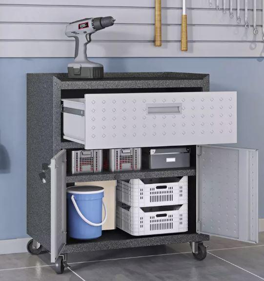 - Includes 2 Mobile Garage Cabinets with 1 Full Extension Drawer, and 2 Doors with 1 Adjustable Shelf, and 1 Worktable.