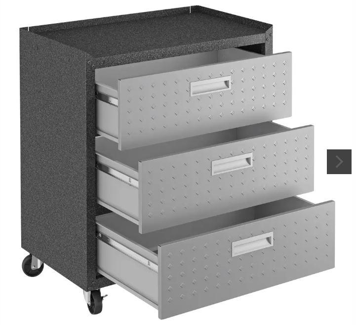 - Includes 1 Mobile Garage Chest with 3 Full Extension Drawers, 1 Garage Cabinet with 1 Adjustable Shelf and Full Extension Drawers, and 1 Worktable.
